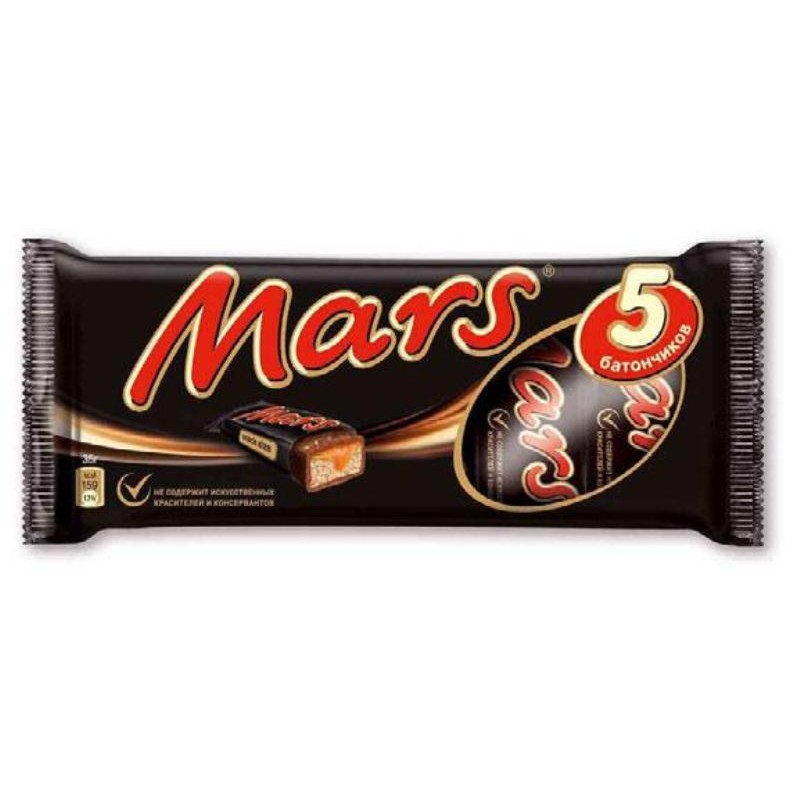 Шоколадные батончики Mars имеют начинку из карамели и нуги, а сверху политы молочным шоколадом. Каждый шоколадный батончик упакован в индивидуальную оболочку, в пакете — пять батончиков. Вес шоколада 202,5 г.