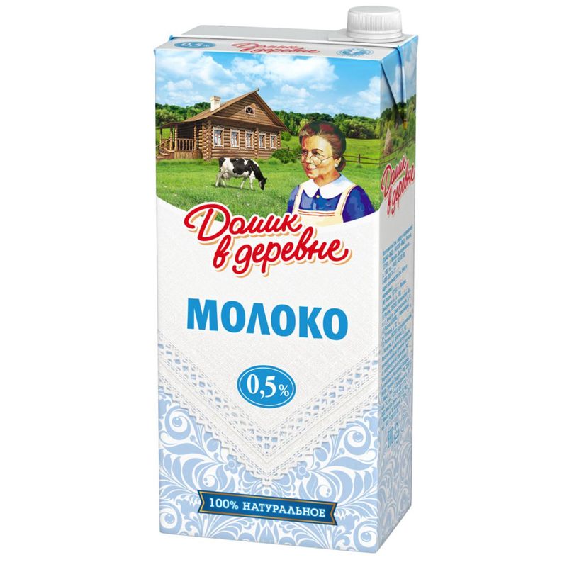Коровье молоко «Домик в деревне» прошло процесс стерилизации, жирность составляет 0,5%. Состав: молоко обезжиренное, молоко цельное. Молоко разлито в картонные коробки с клапаном для открывания, вес — 950 г. Пищевая ценность: жир 0,5г, белки 2,8г, углеводы 4,9г Энергетическая ценность: 35 ккал. Срок годности 9 месяцев. Хранить при t от 0 °C до +25 °C. ГОСТ Р 52090–2003.