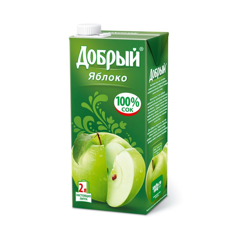 Сок «Добрый» яблочный осветленный восстановленный налит в упаковку объемом 2 л. Подходит для питания детей от трех лет, так как не содержит консервантов и красителей. Плотно закрывающаяся винтовая крышка обеспечивает длительный срок хранения. После вскрытия рекомендуется хранить в холодильнике.