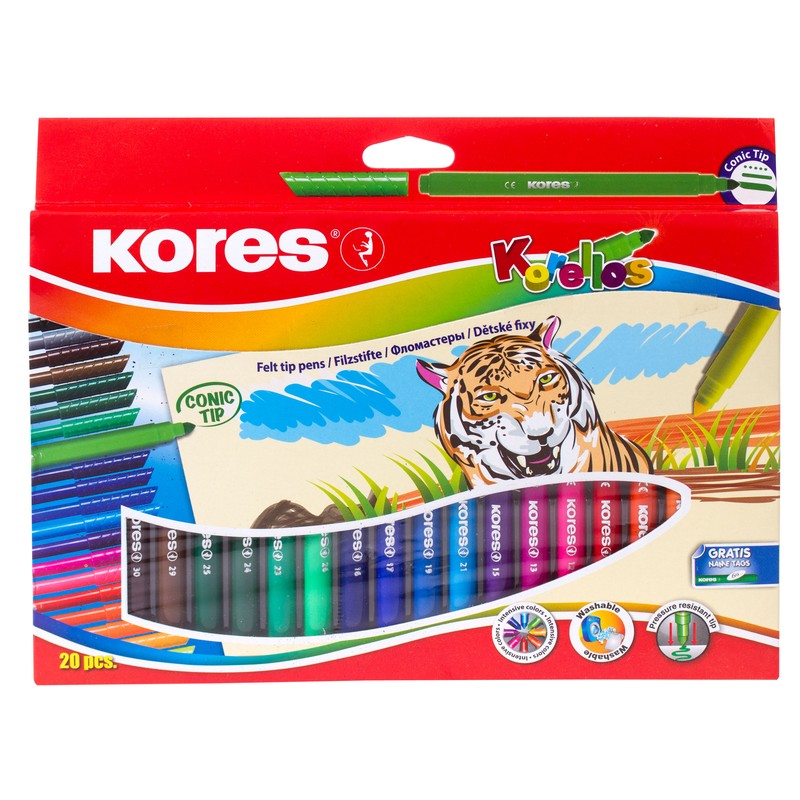 Фломастеры Kores Korellos с коническим стержнем. В наборе 20 ярких и насыщенных цветов. Прекрасно подходят для рисования и раскрашивания: позволяют создавать линии различной толщины. Толщина линии письма: от 1 мм до 4 мм. Длина фломастера 16 см. Хорошая устойчивость к высыханию при открытом колпачке и длительный срок службы. Постоянная и равномерная подача чернил. Вентилируемый колпачок обеспечивает безопасность при использовании фломастеров ребенком (не перекрывает доступ кислорода в случае попадания колпачка в дыхательные пути). Не содержат растворителей и не токсичны: подходят для детей старше 3-х лет. Смываются с текстиля и других поверхностей водой с мылом.