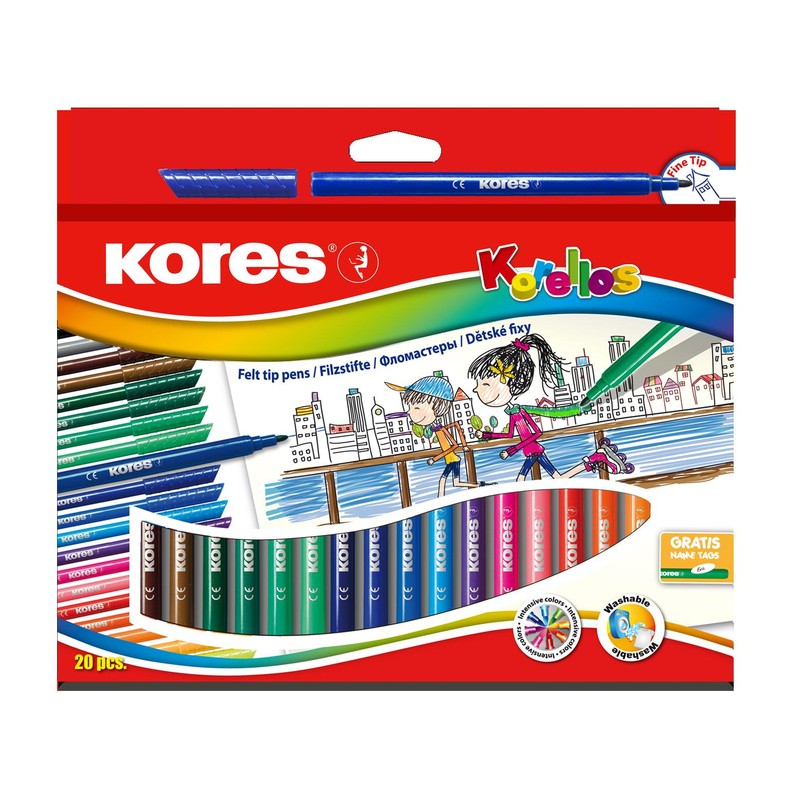 Фломастеры Kores Korellos с тонким стержнем. В наборе 20 ярких и насыщенных цветов. Тонкий стержень прекрасно подходит для точного и аккуратного раскрашивания. Толщина линии письма: около 4 мм. Хорошая устойчивость к высыханию при открытом колпачке и длительный срок службы. Постоянная и равномерная подача чернил. Вентилируемый колпачок обеспечивает безопасность при использовании фломастеров ребенком (не перекрывает доступ кислорода в случае попадания колпачка в дыхательные пути). Не содержат растворителей и не токсичны: подходят для детей старше 3-х лет. Смываются с текстиля и других поверхностей водой с мылом.