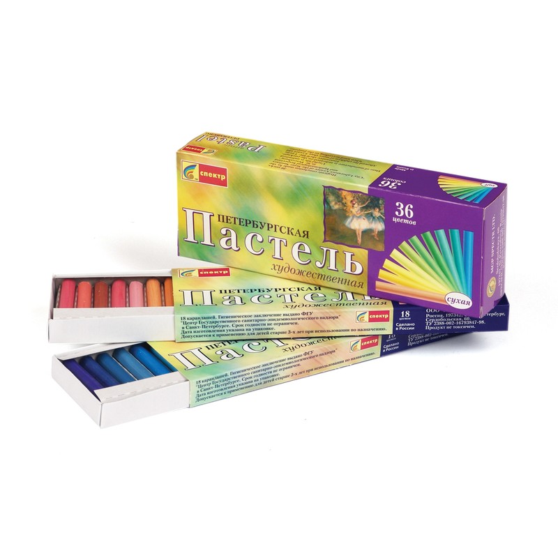 Художественная сухая пастель «Петербургская», 36 штук разного цвета в картонной коробке. Имеет круглую форму, диаметр — 8 мм. Пастель мягкая, не «каменеет» со временем, не осыпается, ею можно работать по мокрой поверхности. Штрих матовый и бархатистый. Подходит для детского творчества в художественных школах.