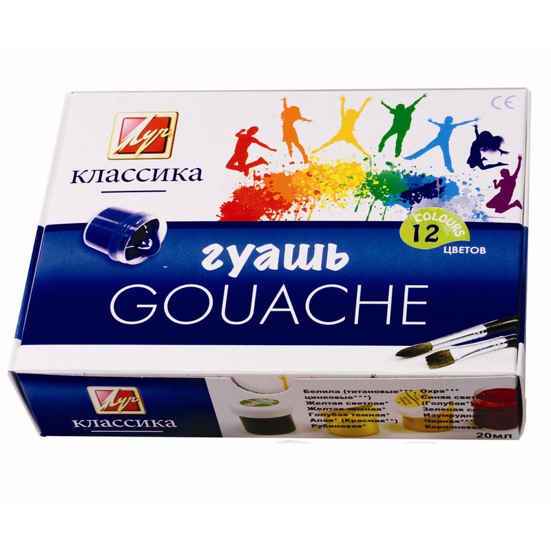 В набор «Классика» входят гуашевые краски 12 цветов. Пластиковые баночки объемом 20 мл в картонной коробке. Гуашь подходит для детского творчества, при необходимости разбавляется водой, безвредна, быстро высыхает, легко смывается с рук.