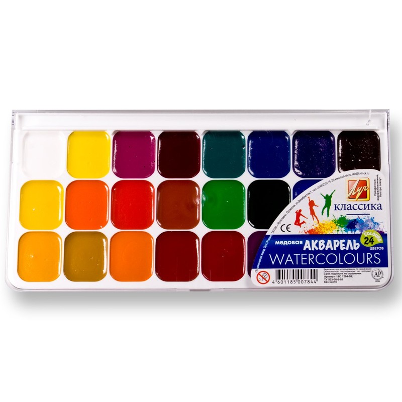 Набор медовых акварельных красок «Классика», 24 цвета (включая белый). Акварель отличается чистотой и прозрачностью тонов, легкостью получения новых оттенков (смешивание, наложение слоев друг на друга). Не токсична, легко смывается с рук и одежды. Краски поставляются в пластиковой упаковке с прозрачной крышкой. Кисточка в комплект не входит.