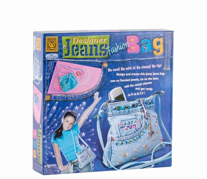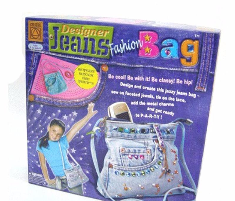Набор для творчества «Модный дизайнер сумок», материалы — бижутерия и ткань. Комплект можно использовать и для других изделий из ткани. В наборе имеется сама джинсовая небольшая сумочка, восемь метров нитки, 320 разноцветных бусинок + две металлические, лента из искусственной замши, одна иголка из металла. Размер сумочки — 20 на 22 см.