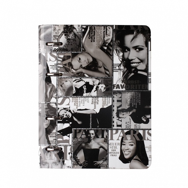 Тетрадь на кольцах представлена в формате А5. Блок — сменный, изготовлен из офсетной бумаги и состоит из 120 листов в клетку. Дизайн обложки — Journals, представлен в единственном виде.